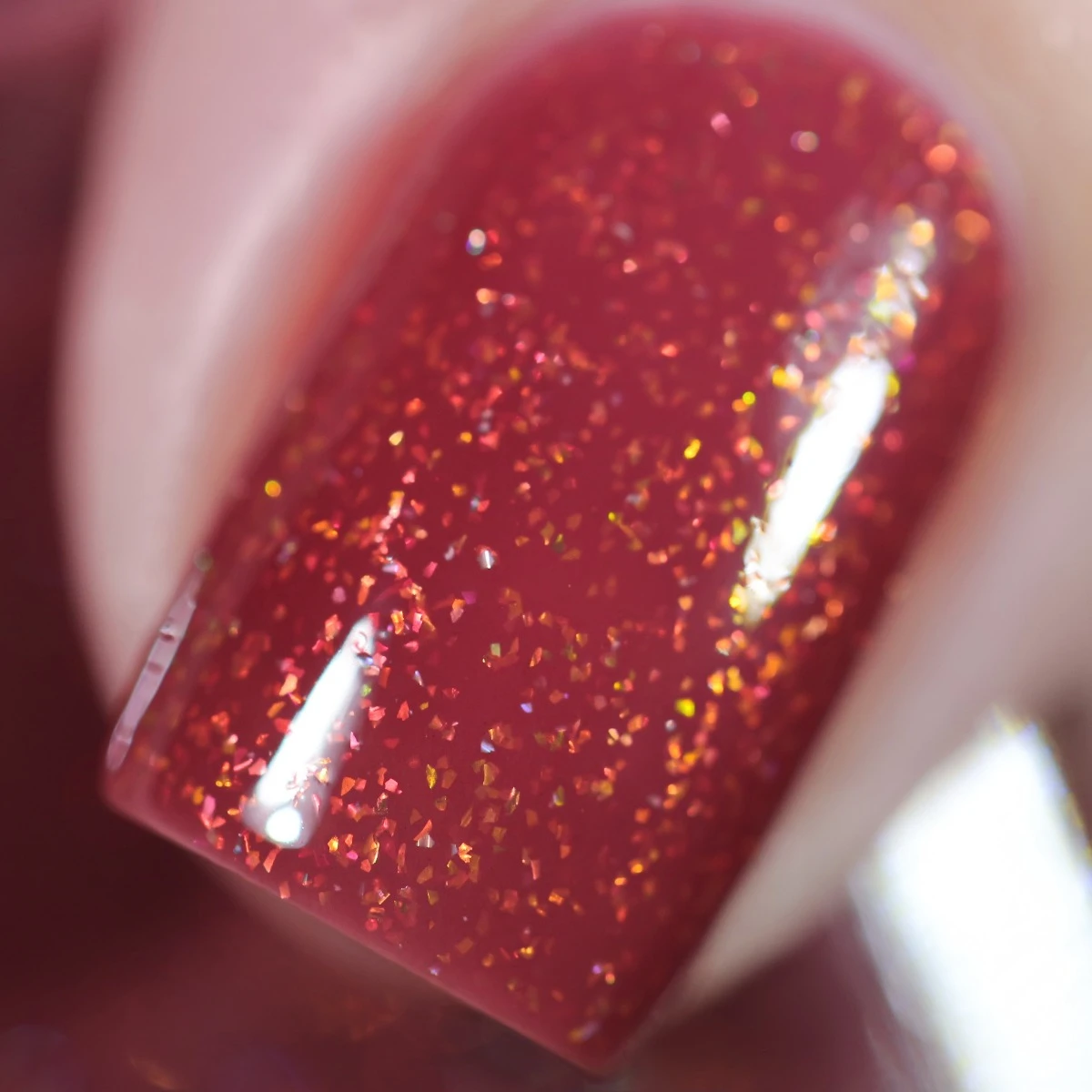 Cross My Heart is a beautifully crisp rustic red holographic jelly loaded with color shifting orange to green flakes and subtly accented with holographic micro-flakes.