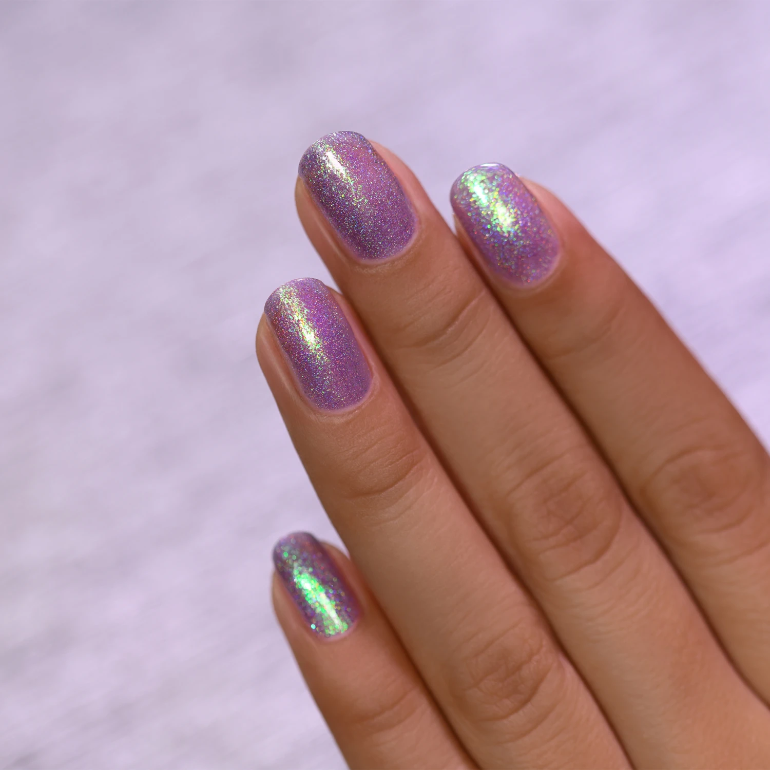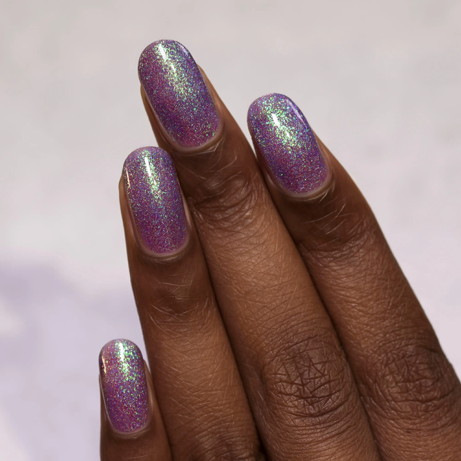 Illuminate the night with sparkling hues of green, purple and red color shifting sparkle! Generously accented with holographic splendor, Drive-In effortlessly gleams an intense and magical iridescent finish!