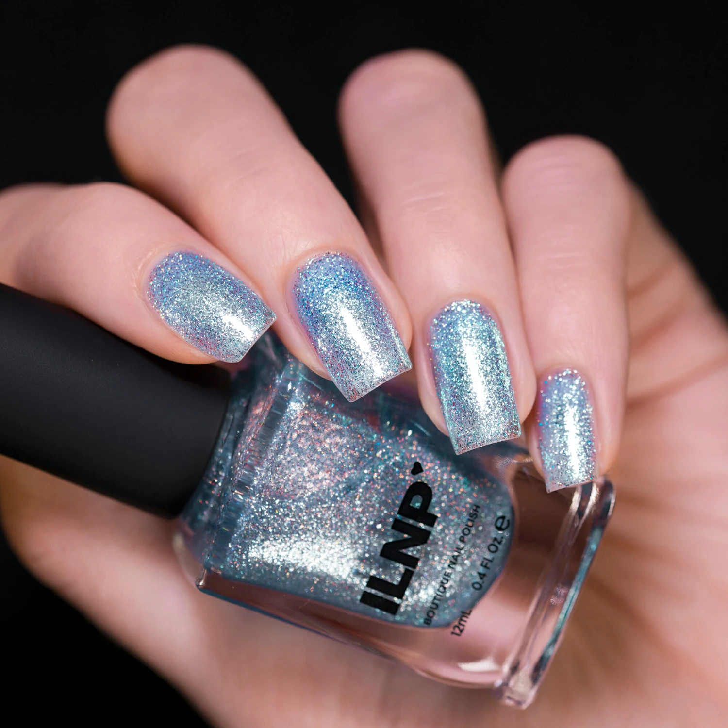 A charmingly captivating iridescent blue sparkle rushes alongside holographic micro-flakes within a gentle blue base, creating a standout reflective finish that’s nothing short of magic. Crowned by a flurry of blue, silver, and purple iridescent flakes, Elsa truly represents a winter wonderland.