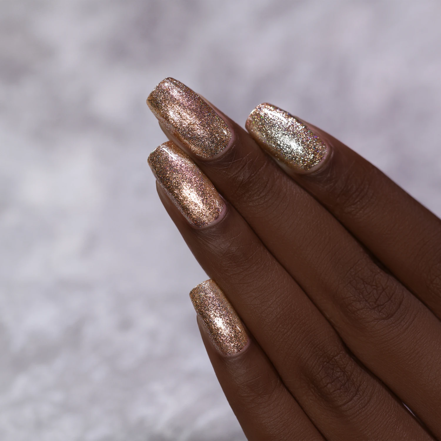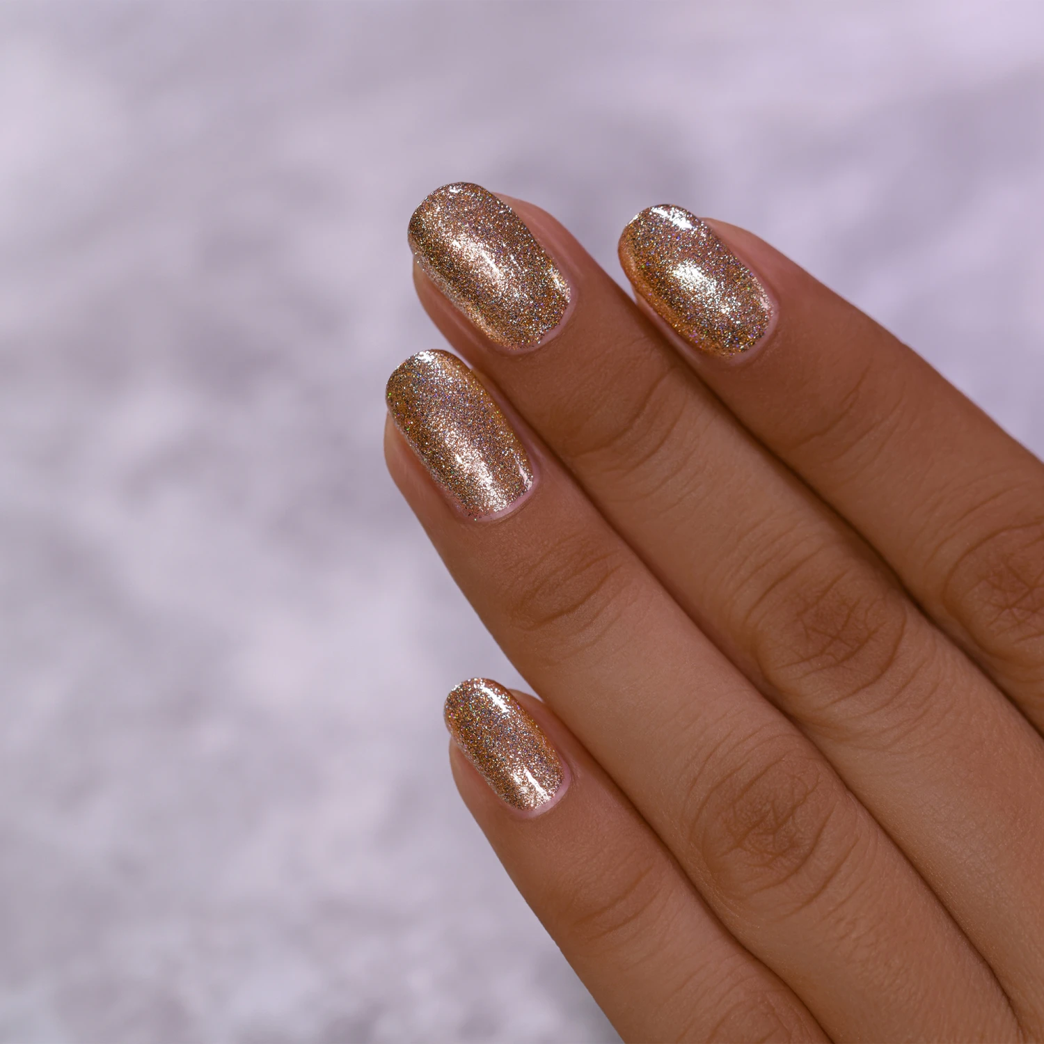 Watch in amazement as light strikes, showcasing an assortment of vivid holographic sparkle and reflective metallic pigments gilded to perfection. Ready to make a statement, Mirage is a miraculous addition to your set of golden shades with its glimmering composition that is destined to make you stand out!