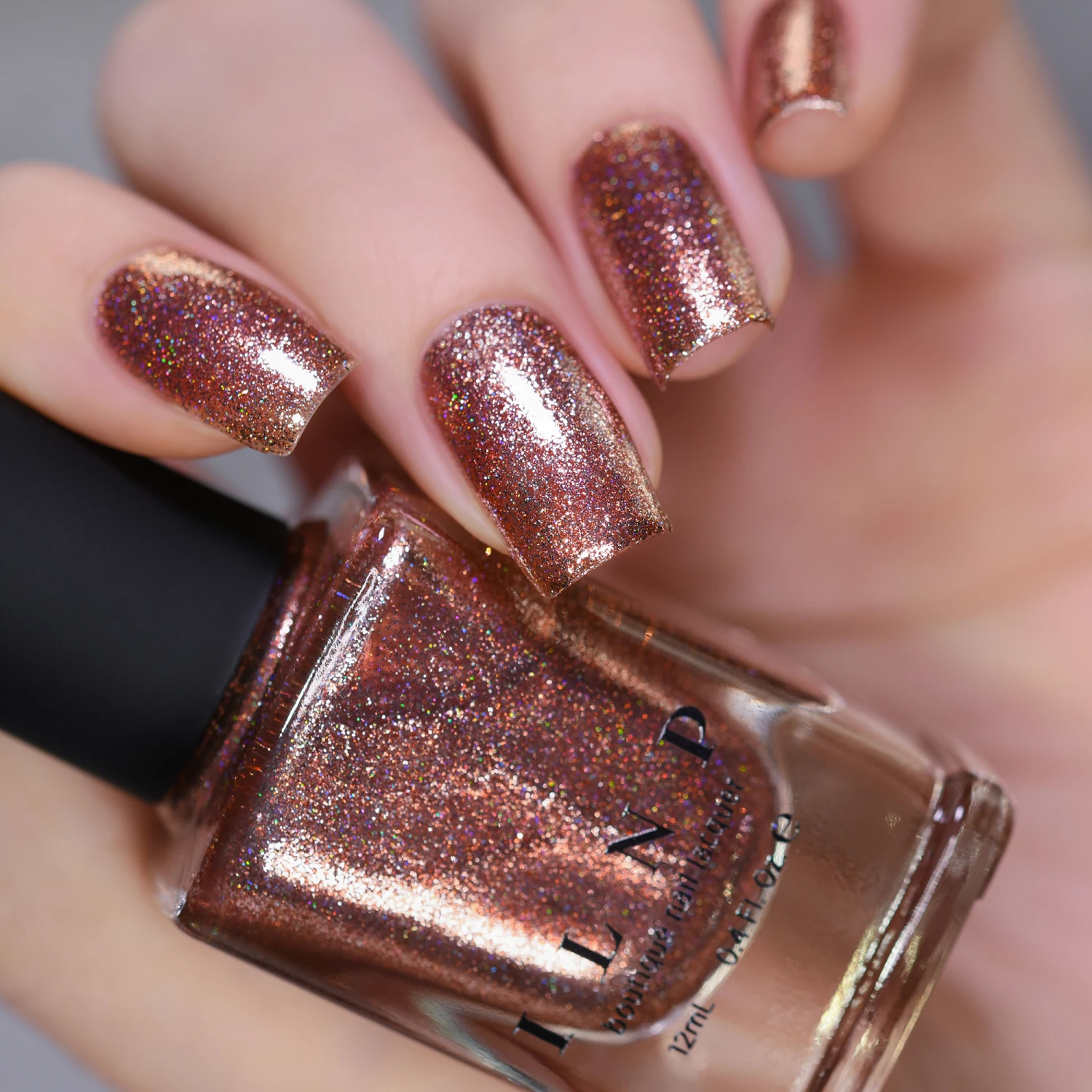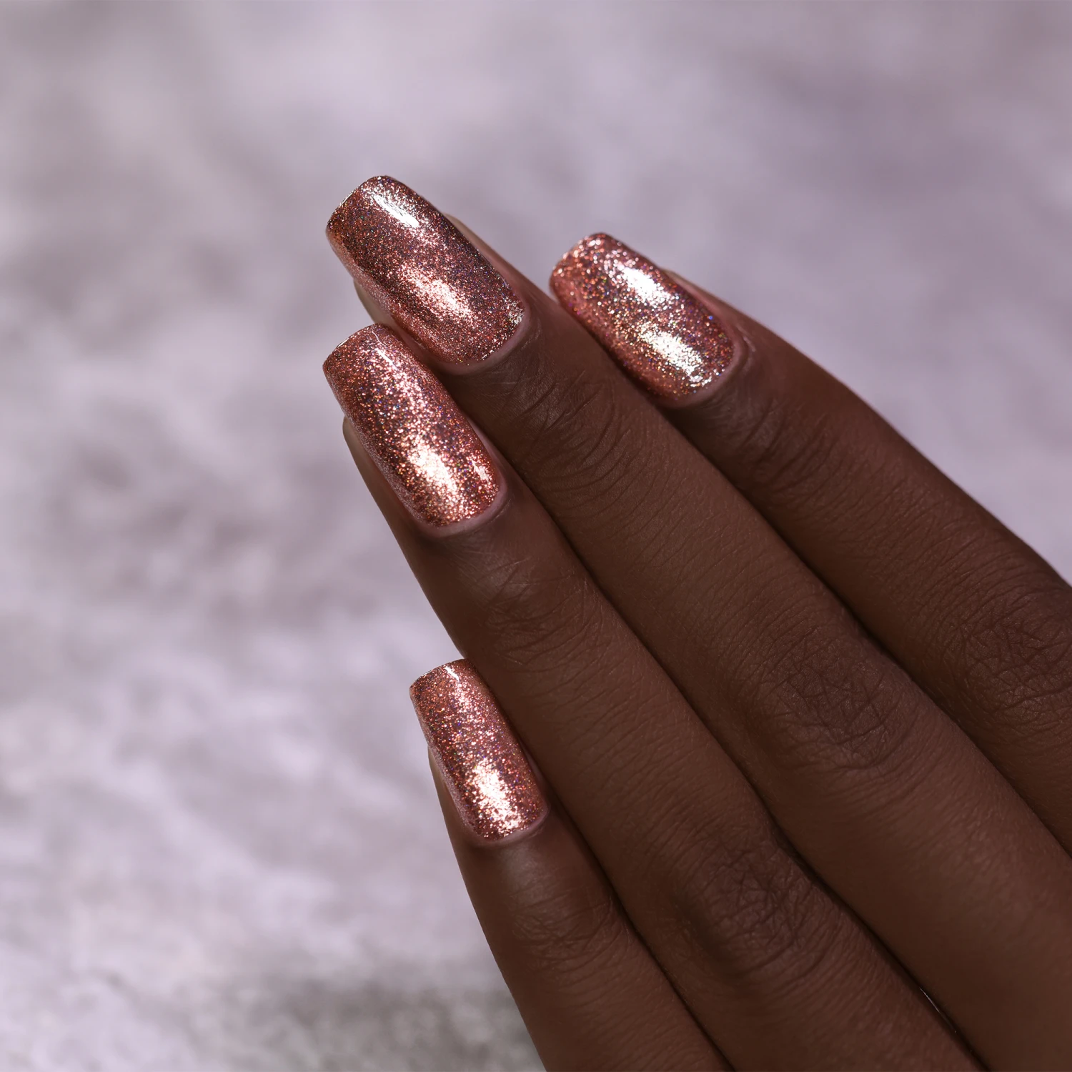 A lustrous copper seamed together flawlessly with hints of vivid holographic micro-flakes and an impressive balance of reflective metallic pigment; Muse is a profoundly beautiful shade!