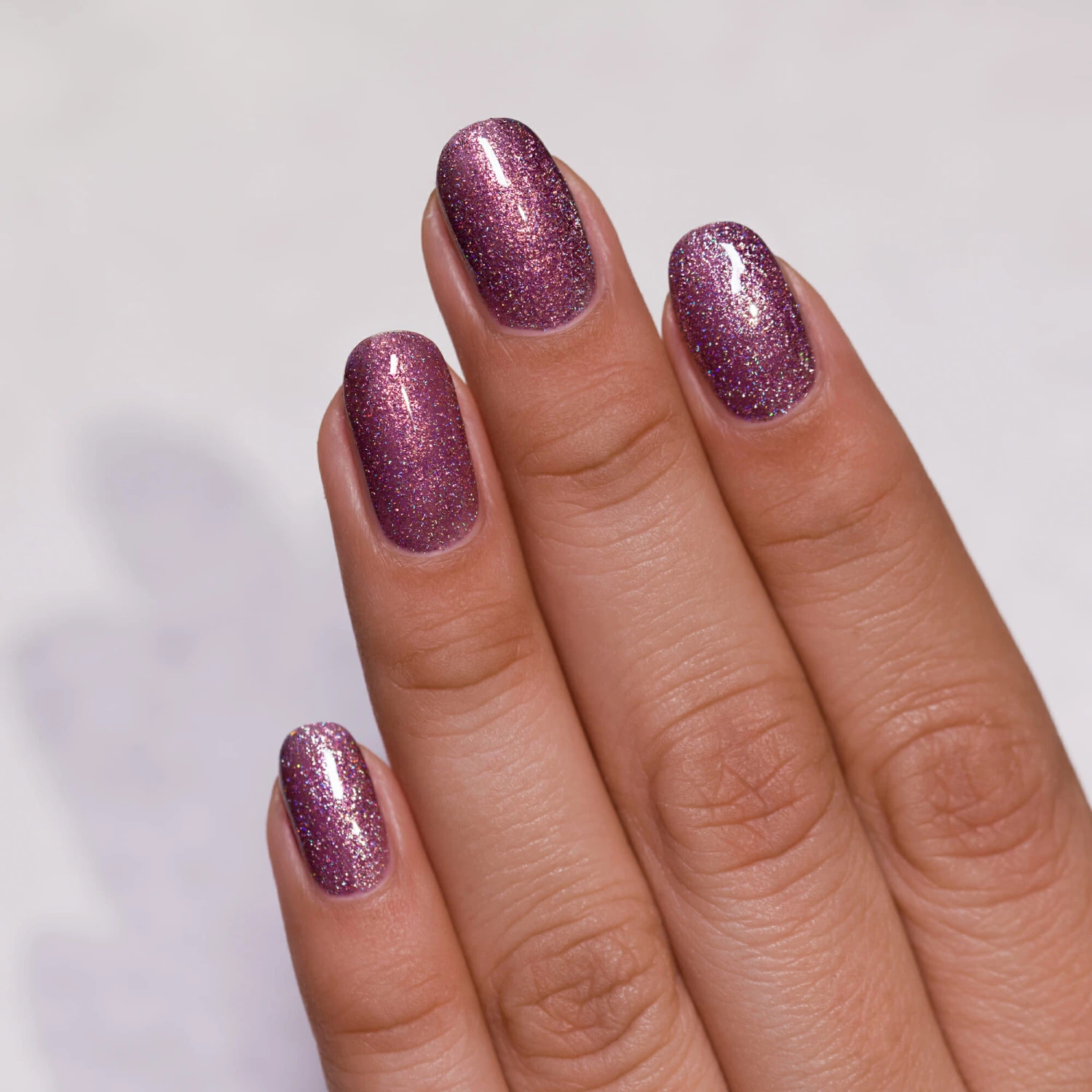 No Promises is a gorgeous dark amaranth pink with a stunning reflective metallic finish!