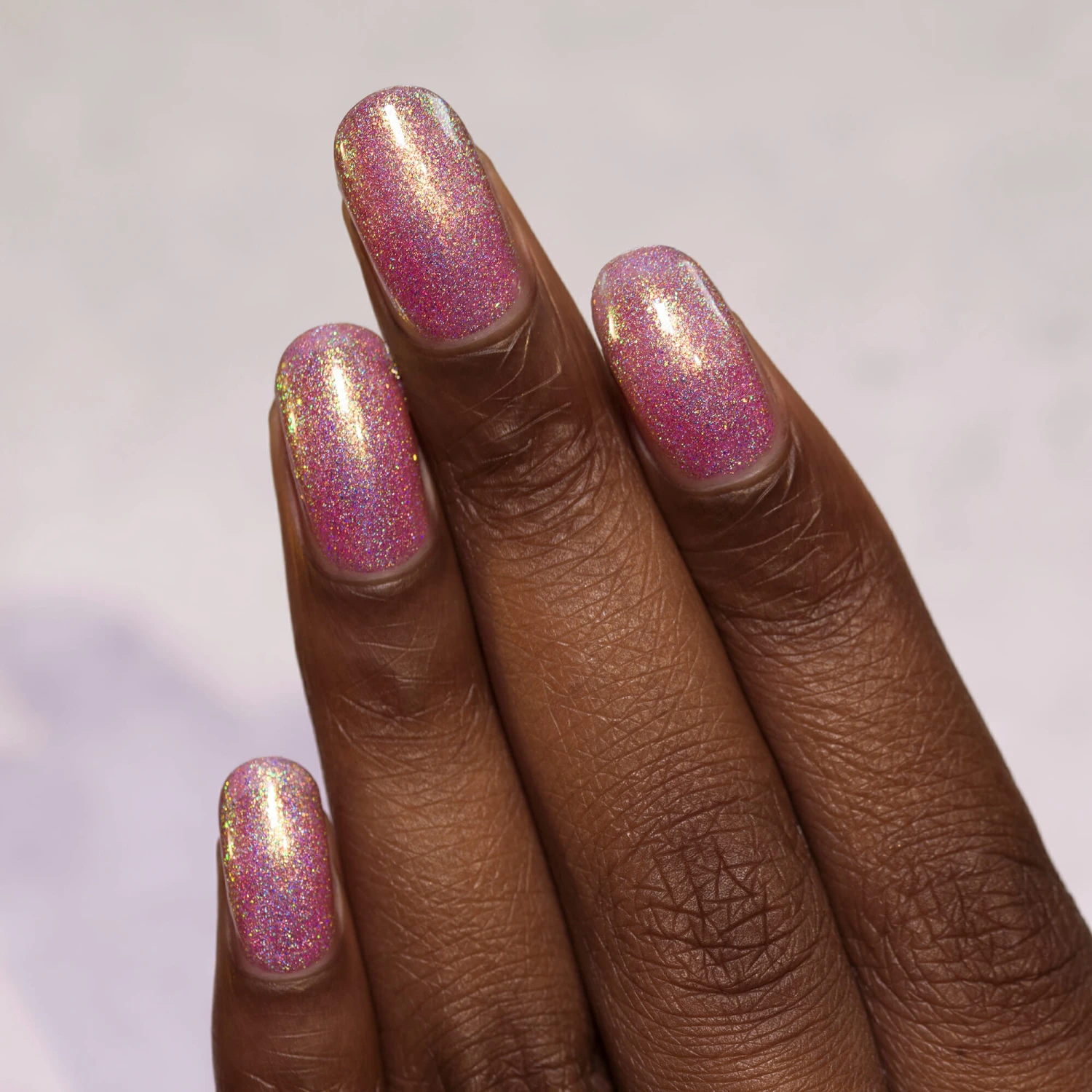 Opal Sunset is a rosy pink jelly holographic with a strong reflective gold-to-green shimmer.