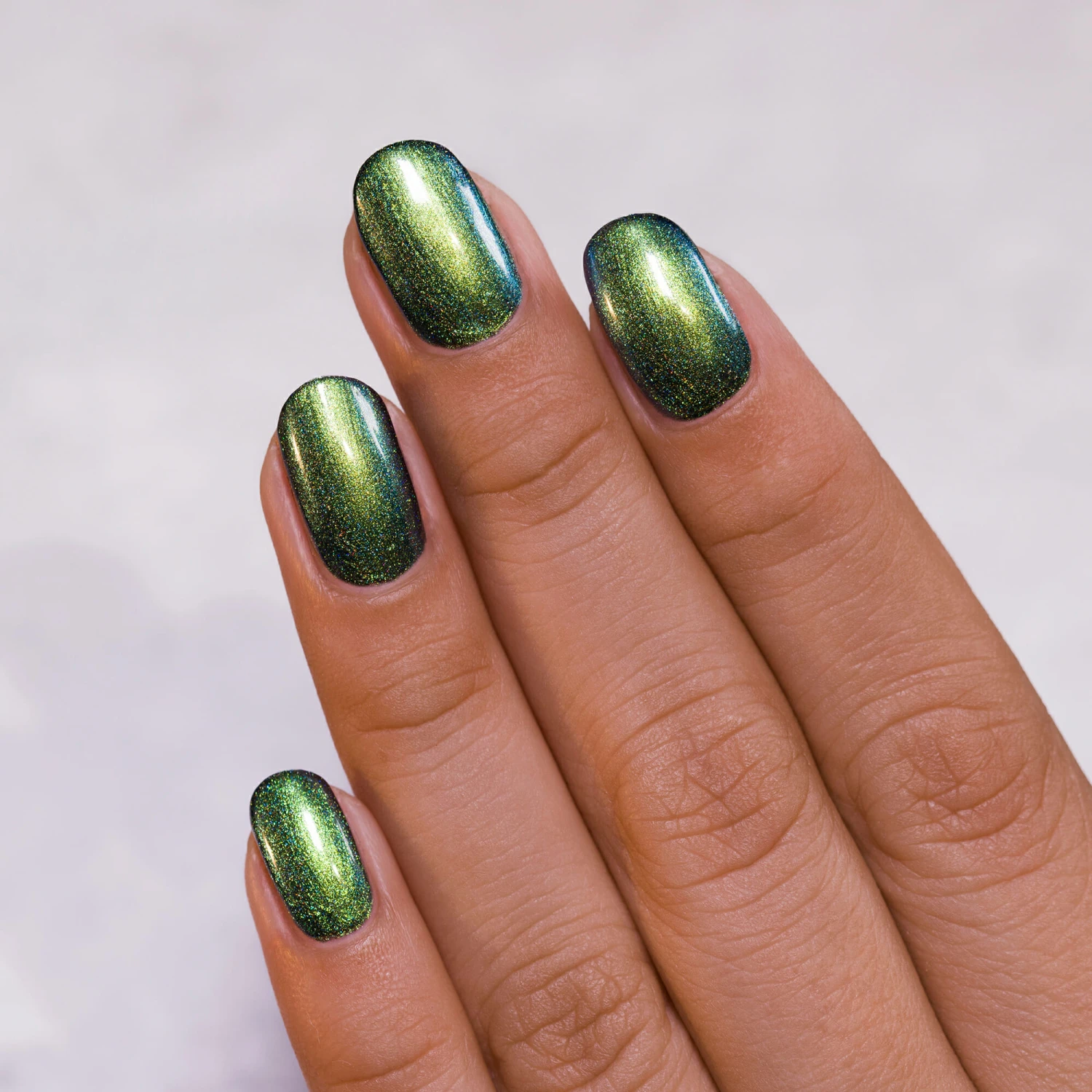 The new Reminisce (H) contains just the right amount of holographic splendor to add a beautiful rainbow sparkle to the polish. All without ruining the intense color shift effect!