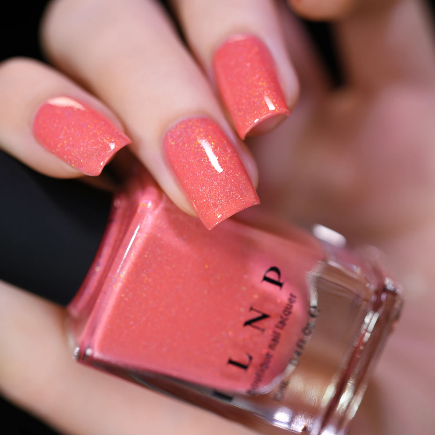 Complete your Summer look with Riley, a beautifully shimmering coral contrasted gorgeously with a beaming orange sparkle! Glistening with holographic micro-flakes, Riley’s vivid base is sure to compliment your sun-kissed glow with its own touch of magical sparkle!