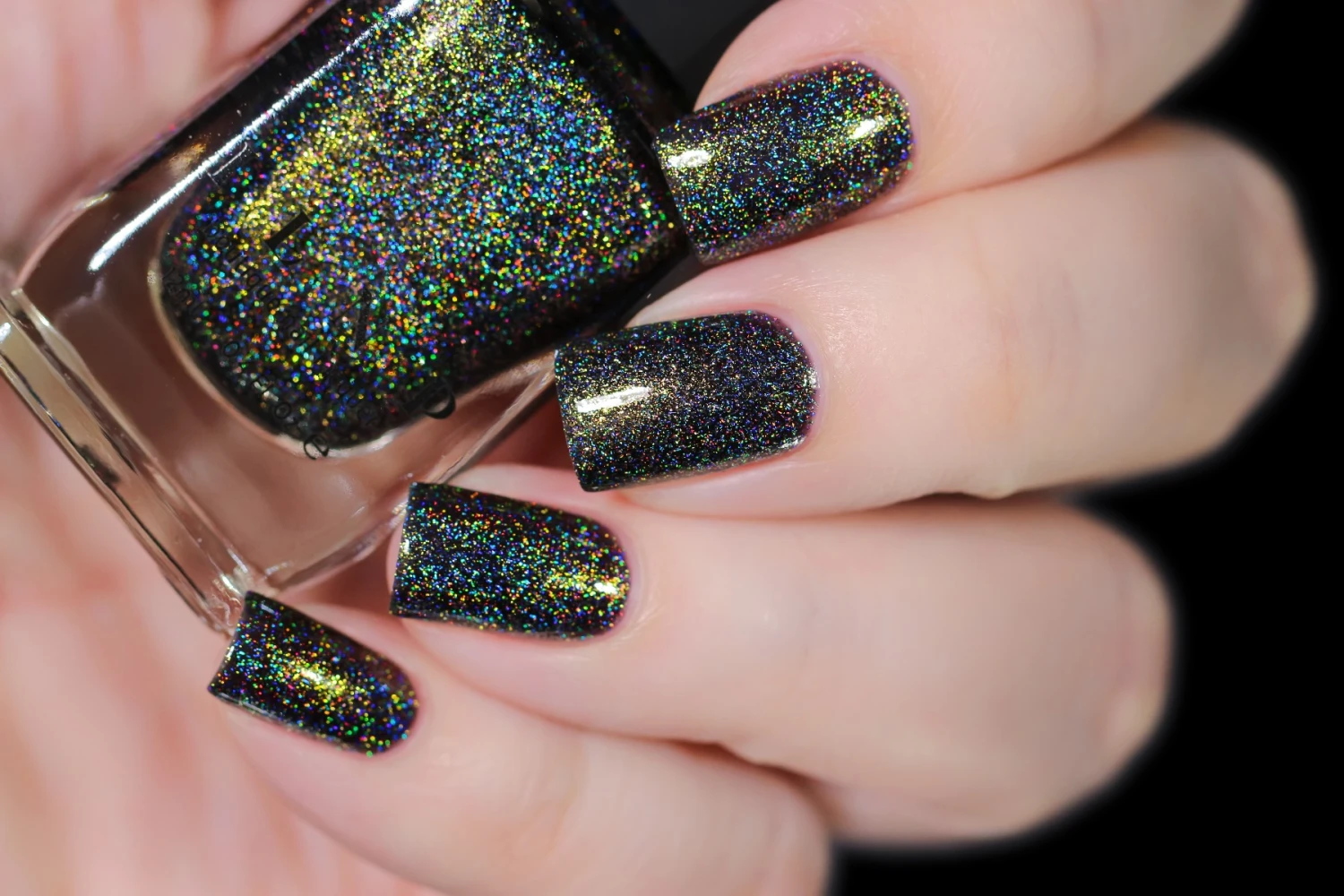 Riot’s primary hues of golden yellow, yellow-green, and even a cool blue at the right angle play beautifully alongside holographic micro-flakes ranging in size in a deep black base. It’s a riot!