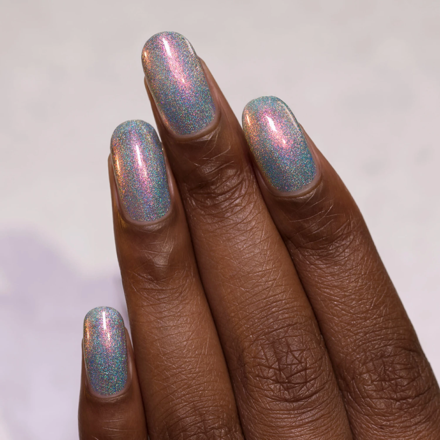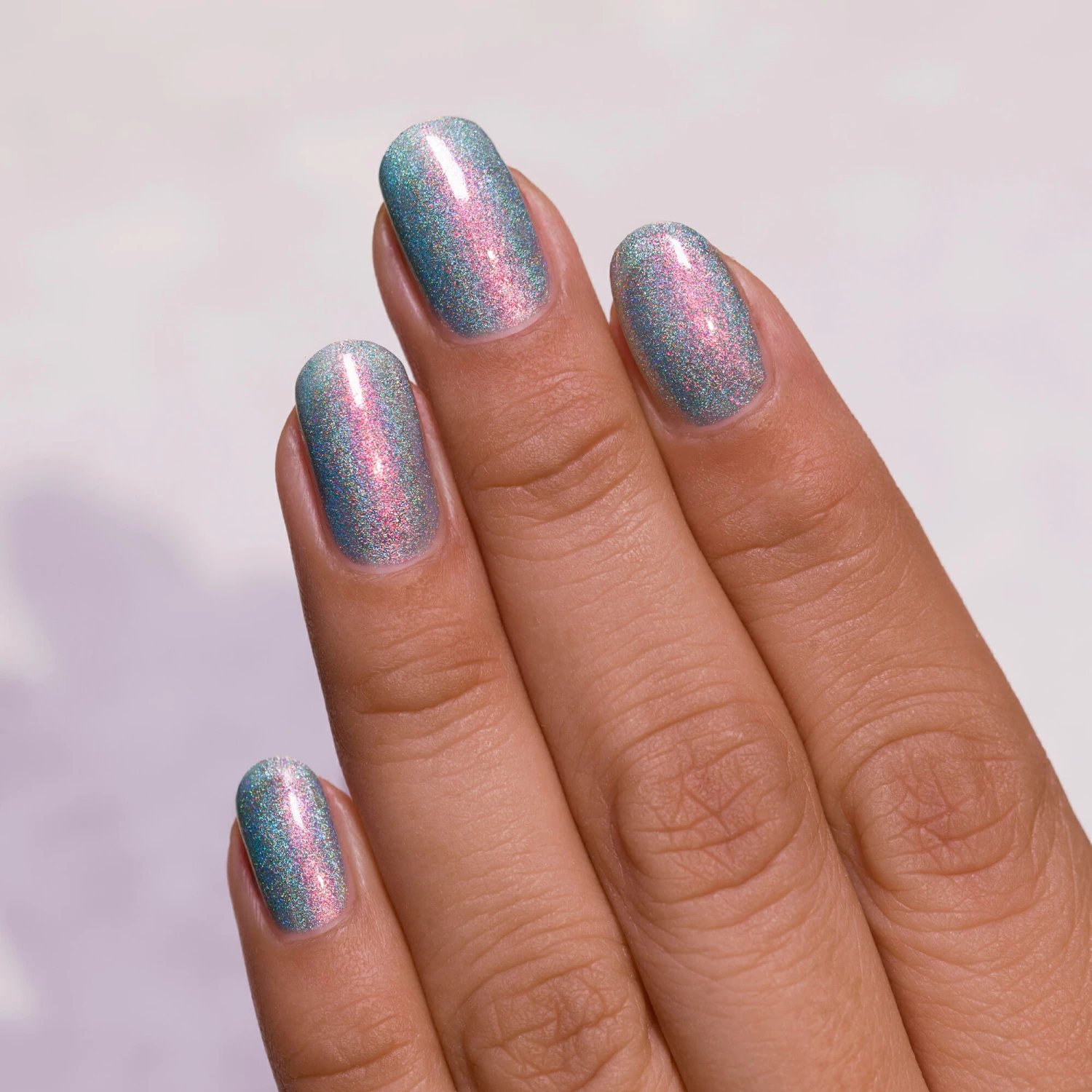 Beaming from holographic splendor, Summer Lovin’ features a radiating pink sparkle that shifts through hues of yellow and green depending on the angle of your fingertips!