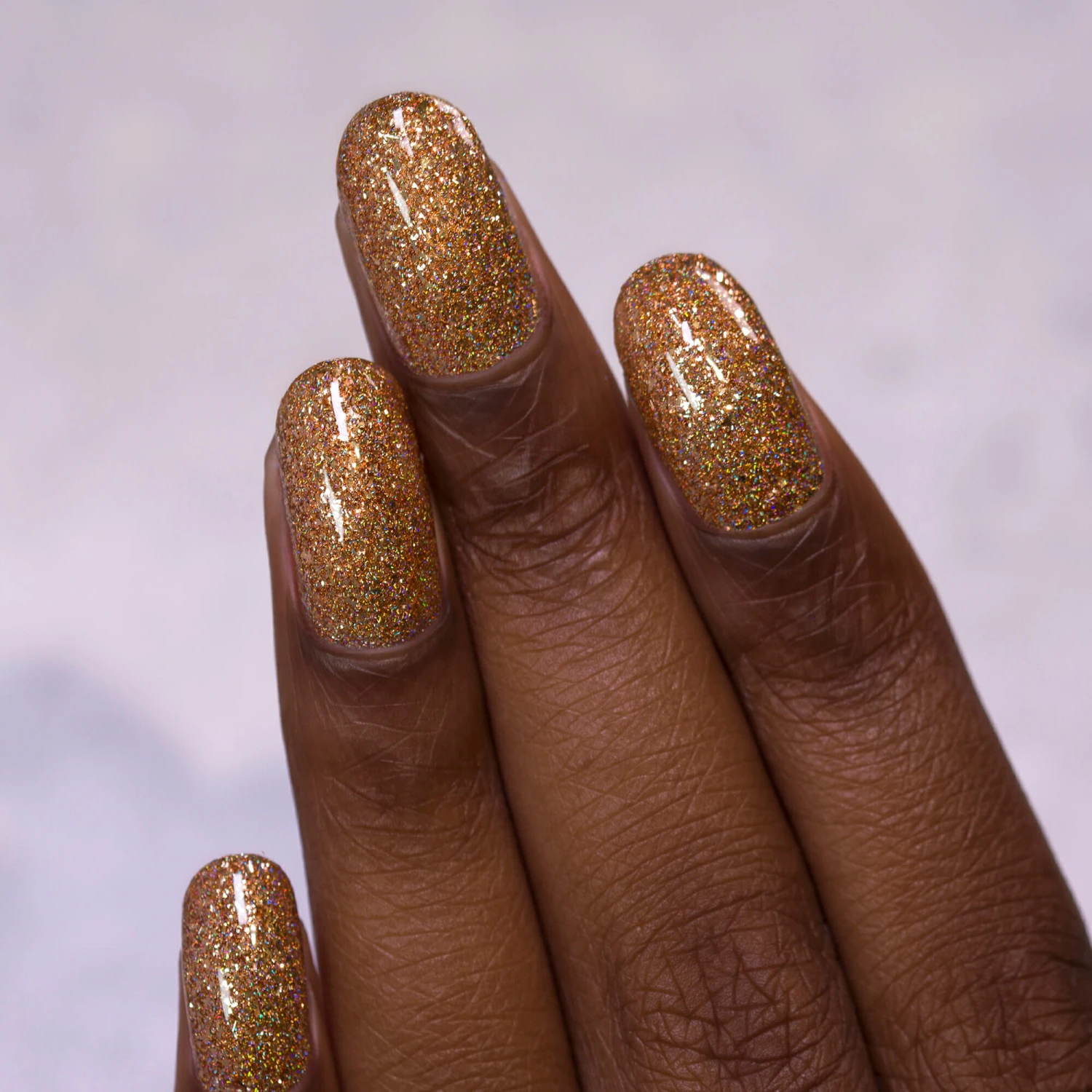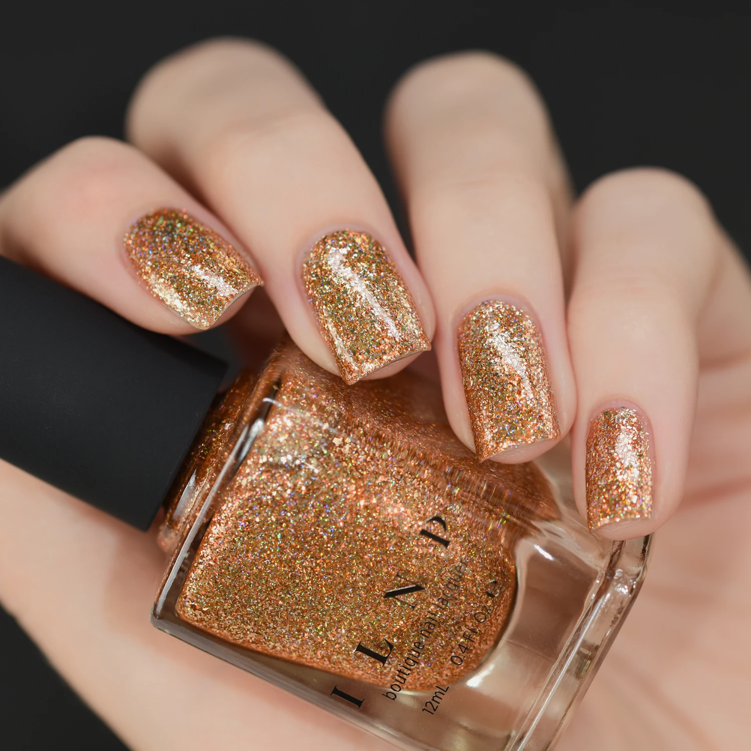 The Harpist is a stunningly warm and vibrant holographic Ultra Metallic with orange and copper hues reminiscent of a beautiful autumn sunset.